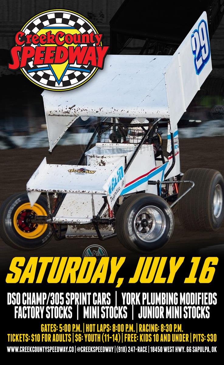 July 12, 2022 (SAPULPA, Okla.) Creek County Speedway is back on track Saturday, July 16 2022, featuring the Dyno Services of Oklahoma Champ 305 Sprints, York Plumbing Modifieds, Factory Stocks, Mini Stocks, and Junior Mini Stocks.